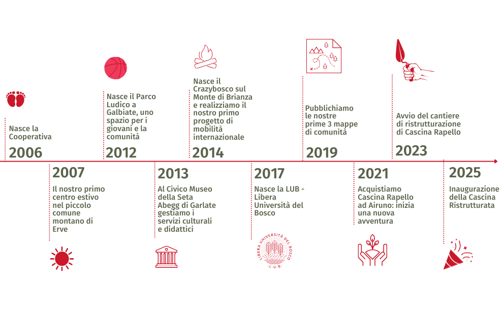 Siamo nati nel 2006 a Calolziocorte, in provincia di Lecco, con il sogno di coltivare insieme il futuro delle nuove generazioni realizzando progetti educativi che riconnettessero i giovani al loro territorio e alla loro storia.