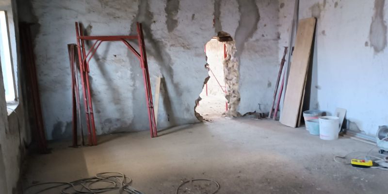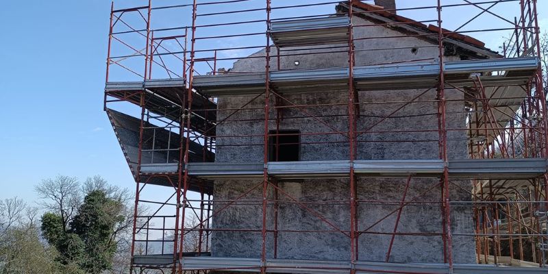 In questo mese abbiamo completato la realizzazione dei solai in legno del primo piano, iniziato l’apertura di nuovi vani di porte e finestre e modificato quelle esistenti, allestito i ponteggi e iniziato la rimozione e il rifacimento del tetto esistente.