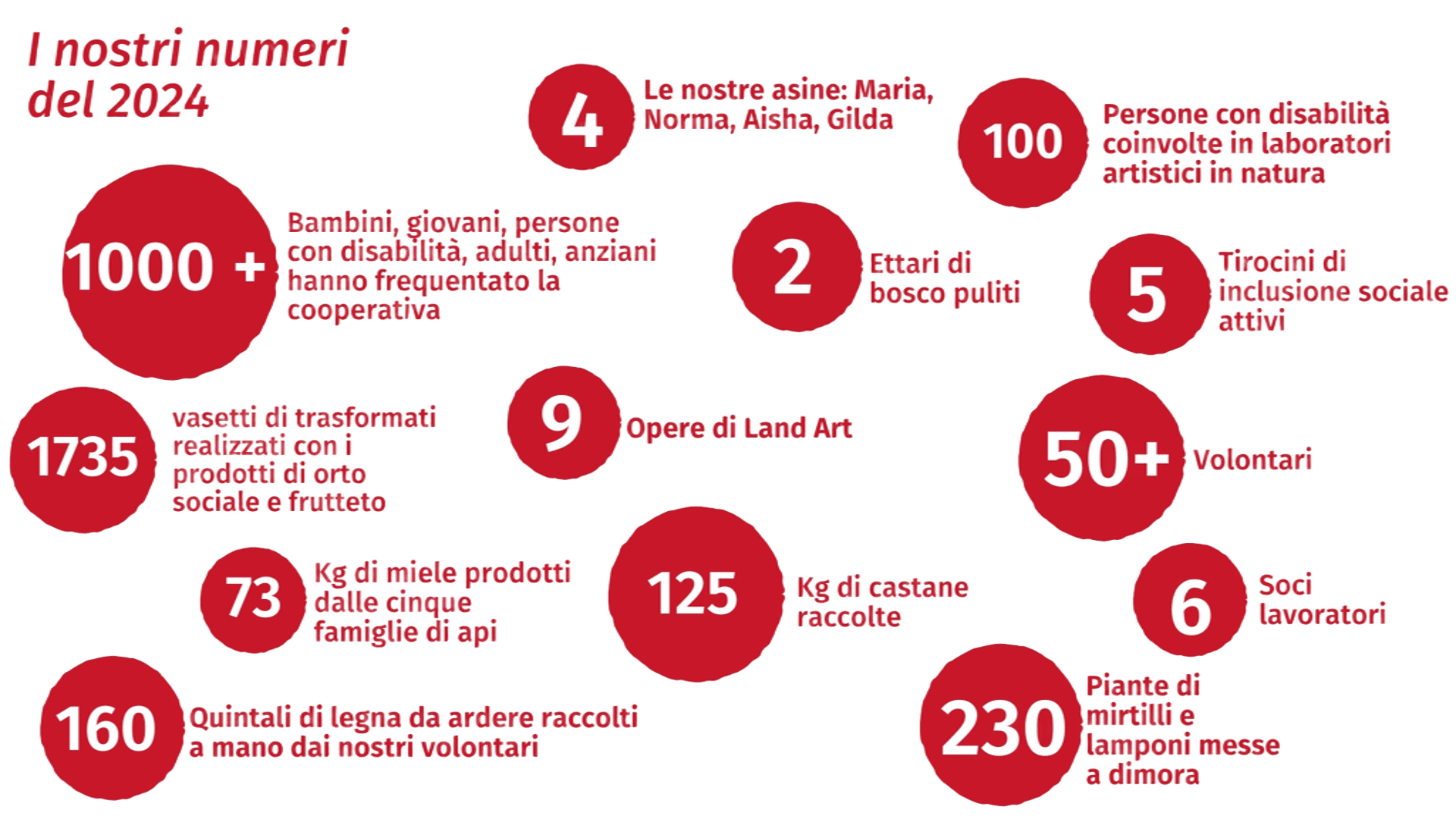 I terrazzamenti sono diventati orti, i rovi si sono trasformati in frutteti, i sentieri sono stati riaperti e resi accessibili. Un castagneto accoglie ora un percorso di land art, con opere cariche di valore sociale. E poi ci sono le api, le asine, i boschi e i prati: presenze vive di un luogo che oggi respira relazioni, cultura e natura.